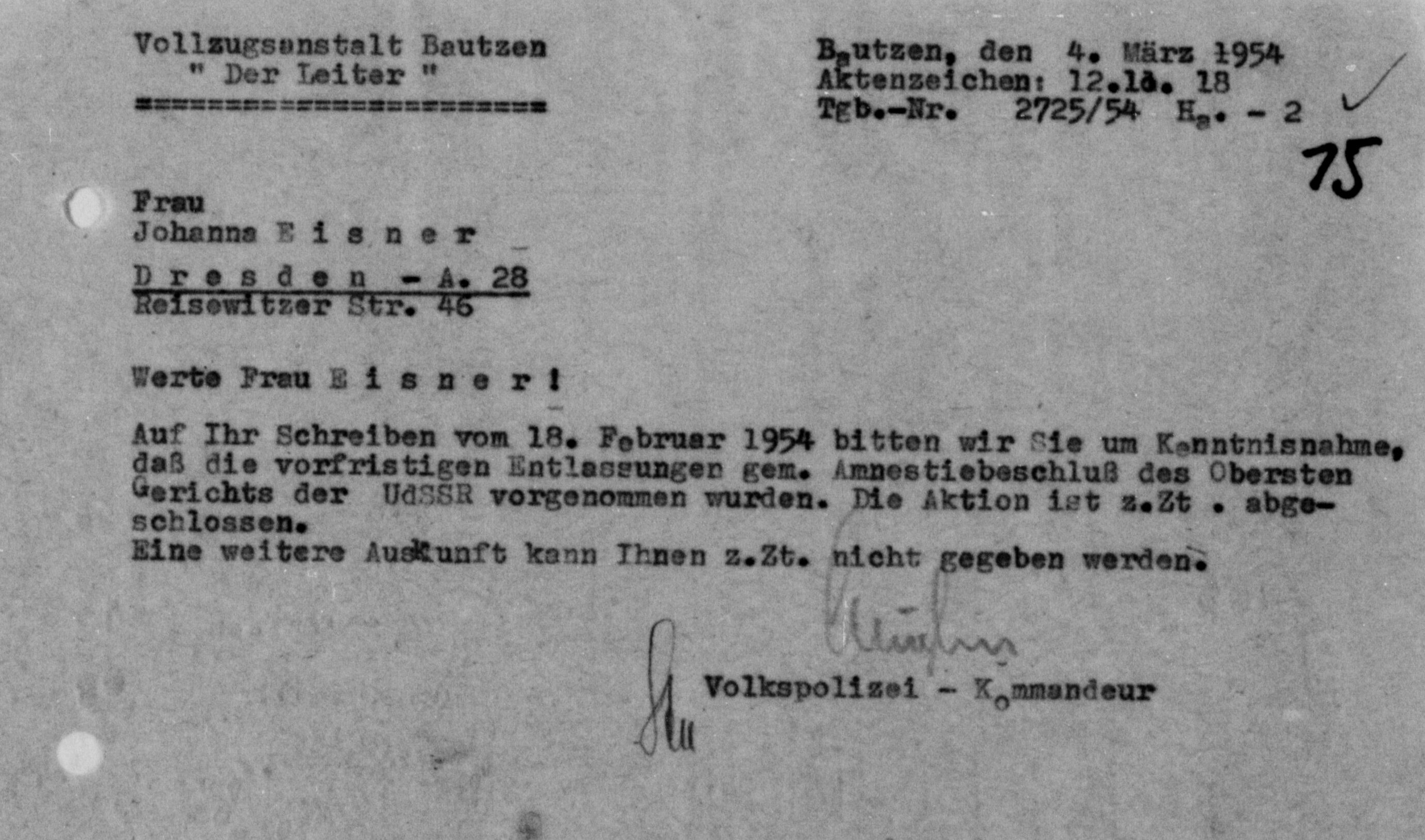 Während der Haft war er hauptsächlich in der Gefängnisküche und bei Bauarbeiten eingesetzt. Die Gefängnisleitung urteilte im Dezember 1954 über Eisner, dass er „verträglich und hilfsbereit“ sei, jedoch „das Verwerfliche seiner Tat“ nicht einsehe. Er sei zudem weiterhin der Sowjetunion gegenüber feindlich eingestellt und zeige kein Interesse an der „politischen und wirtschaftlichen Entwicklung“ der DDR. Infolge des Gnadenerlasses durch den Präsidenten der DDR, Wilhelm Pieck, wurde Eisner am 7. April 1955 aus der Haft entlassen und kehrte nach Dresden zu seiner Frau zurück. Später siedelten er und seine Gattin in die Bundesrepublik über. Dort verstarb Eisner, inzwischen verwitwet, am 29. September 1981 in Regensburg.