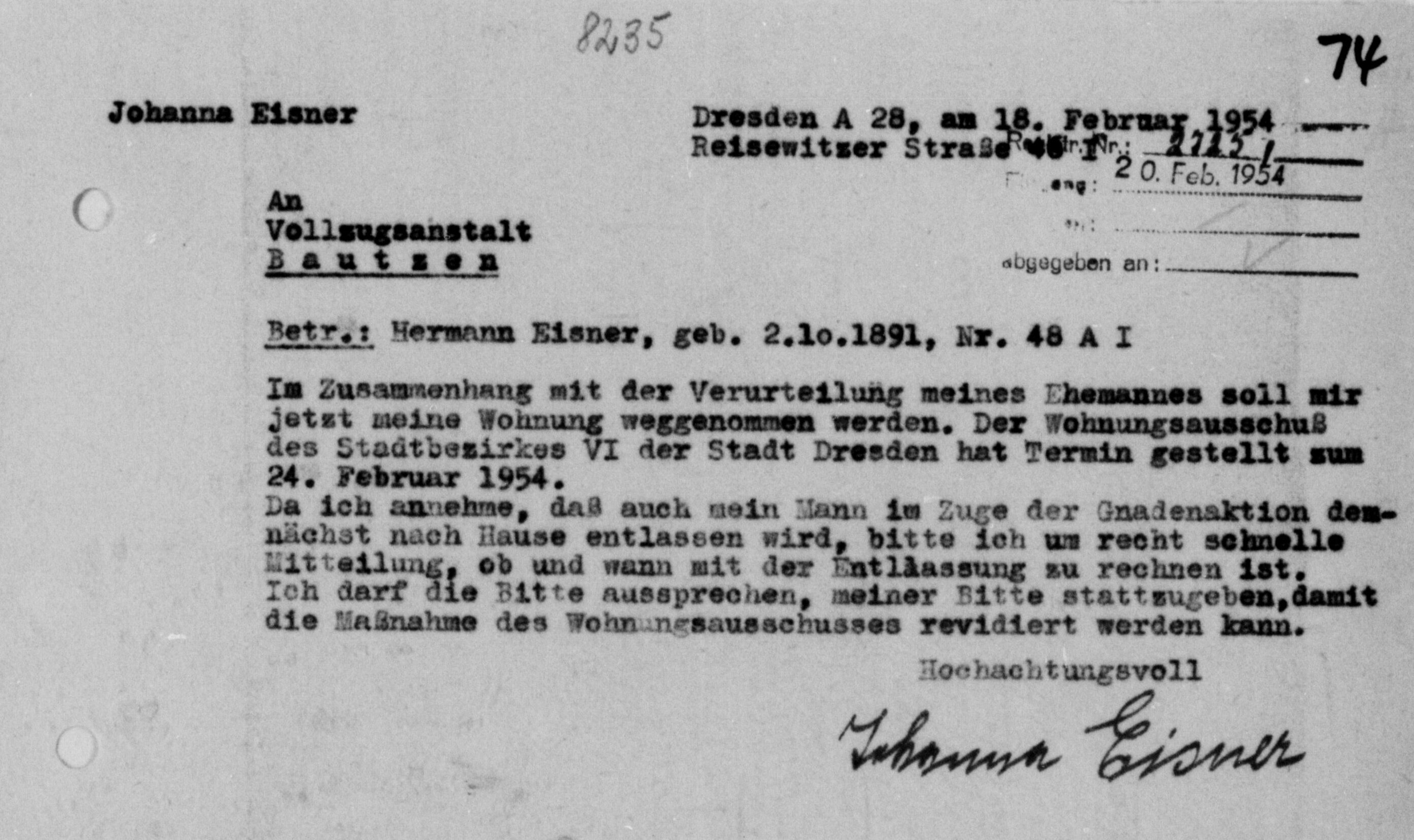 Nach Kriegsende ging Eisner im Dezember 1945 erneut eine Ehe ein. Er blieb bei der Reichsbahn angestellt, zuletzt als Oberlokomotivführer. Laut Führungszeugnis der Strafvollzugsanstalt Bautzen beschädigte er Anfang 1951 aus Frustration über die geringe Arbeitsvergütung ein Porträt Joseph Stalins, wofür ihn sowjetische Sicherheitskräfte am 18. Februar 1951 verhafteten und dem Untersuchungsgefängnis in der Bautzner Straße in Dresden zuführten. Am 25. April 1951 verurteilte ihn dort das Militärtribunal der 1. Garde-Panzerarmee (Feldpostnummer 08640) wegen „antisowjetischer Propaganda“ zu 25 Jahren „Besserungsarbeitslager“. Seine Überführung in die Strafvollzugsanstalt Bautzen erfolgte am 16. Mai 1951.