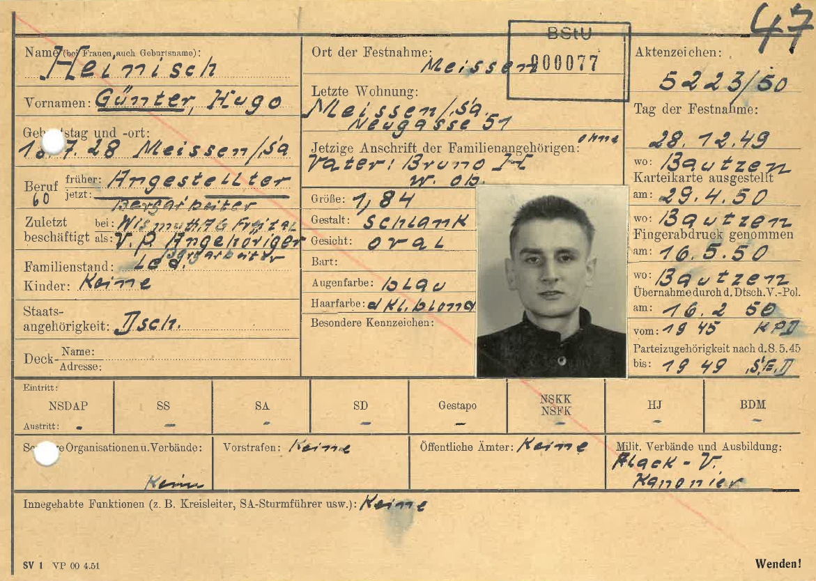 Man warf ihm vor, sich beim Besuch einer Polizeischule in Berlin gegenüber dem englischen Geheimdienst zur Zusammenarbeit verpflichtet zu haben und sowohl über die deutsche Polizei als auch über die sowjetischen Truppen in Deutschland berichtet zu haben. Möglicherweise war Günter Heinisch durch den Kontakt zu Christa Aurig, einer Jugendliebe, in das Visier der Ermittler geraten. Deren Verlobter, der Polizeischüler Werner Andreck, war wegen Kontakten zur SPD-Jugendorganisation „Die Falken“ von einem SMT verurteilt worden. Am 17. März 1950 verurteilte das Militärtribunal der 1. Garde-Mechanisierten Armee (Feldpostnummer 08640) Günter Heinisch am Münchner Platz in Dresden auf der Grundlage von § 58-6 des StGB der RSFSR zu 25 Jahren „Besserungsarbeitslager“.