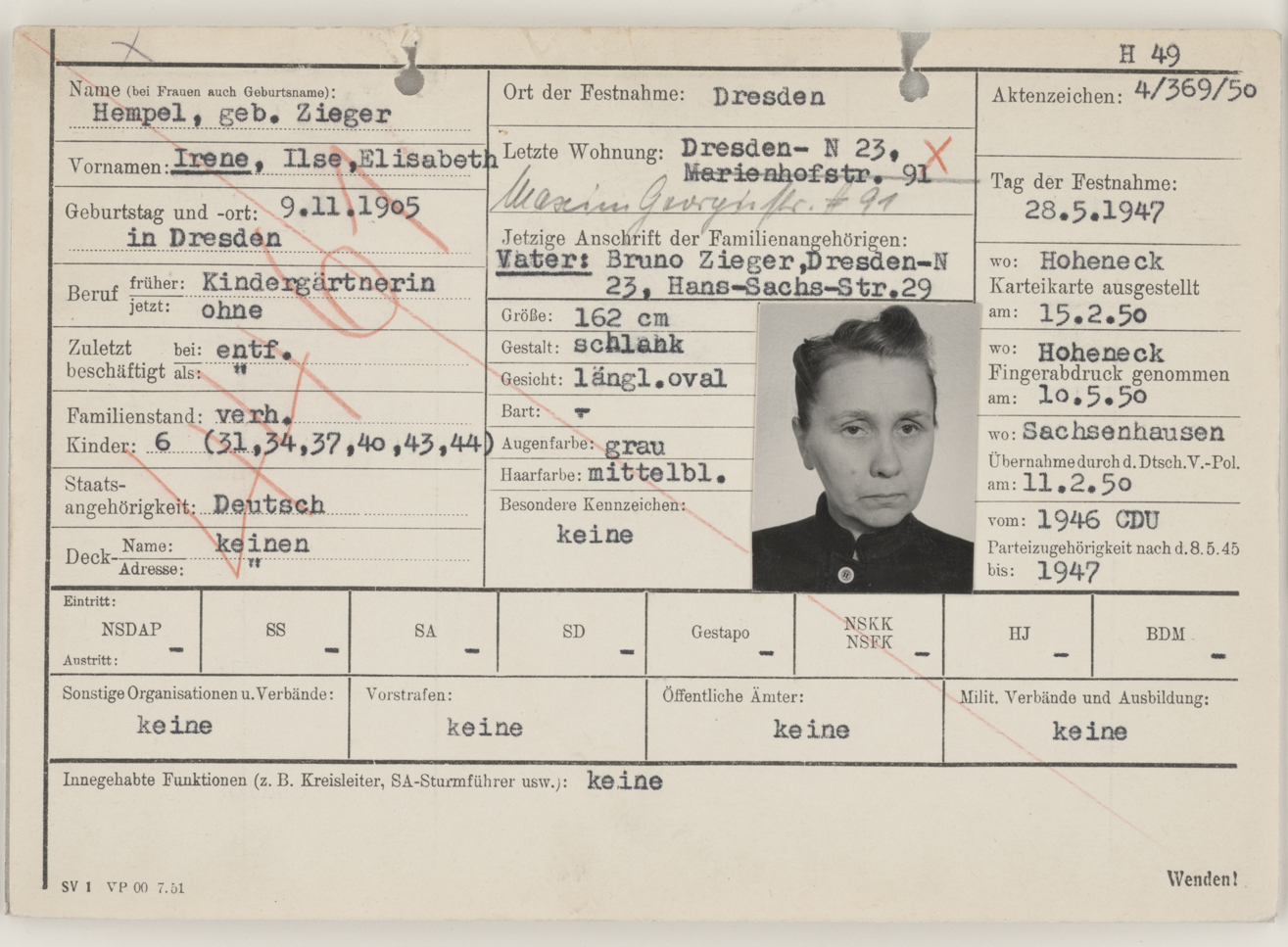 Am 28. Mai 1947 wurden Irene und Alfred Hempel in ihrer Dresdner Wohnung und Liselotte Otto in ihrer Wohnung in Kummersdorf von Angehörigen der sowjetischen Sicherheitsorgane verhaftet und in das Dresdner Gefängnis der sowjetischen Geheimpolizei am Münchner Platz überführt. Die Kinder wussten lange nicht, wohin die Eltern gebracht worden waren. Nach mehr als einem Jahr und acht Monaten Untersuchungshaft verurteilte das Militärtribunal der Sowjetischen Militäradministration des Landes Sachsen Irene Hempel gemeinsam mit ihrem Ehemann und ihrer Schwester sowie 17 weiteren Angeklagten nach zweitägigem Prozess am 11. Februar 1949 in Dresden auf der Grundlage von Artikel 58-6, Abschnitt 1 (Spionage) und Artikel 58-11 (konterrevolutionäre Gruppenbildung) des StGB der RSFSR zu 25 Jahren Haft in einem „Besserungsarbeitslager“.