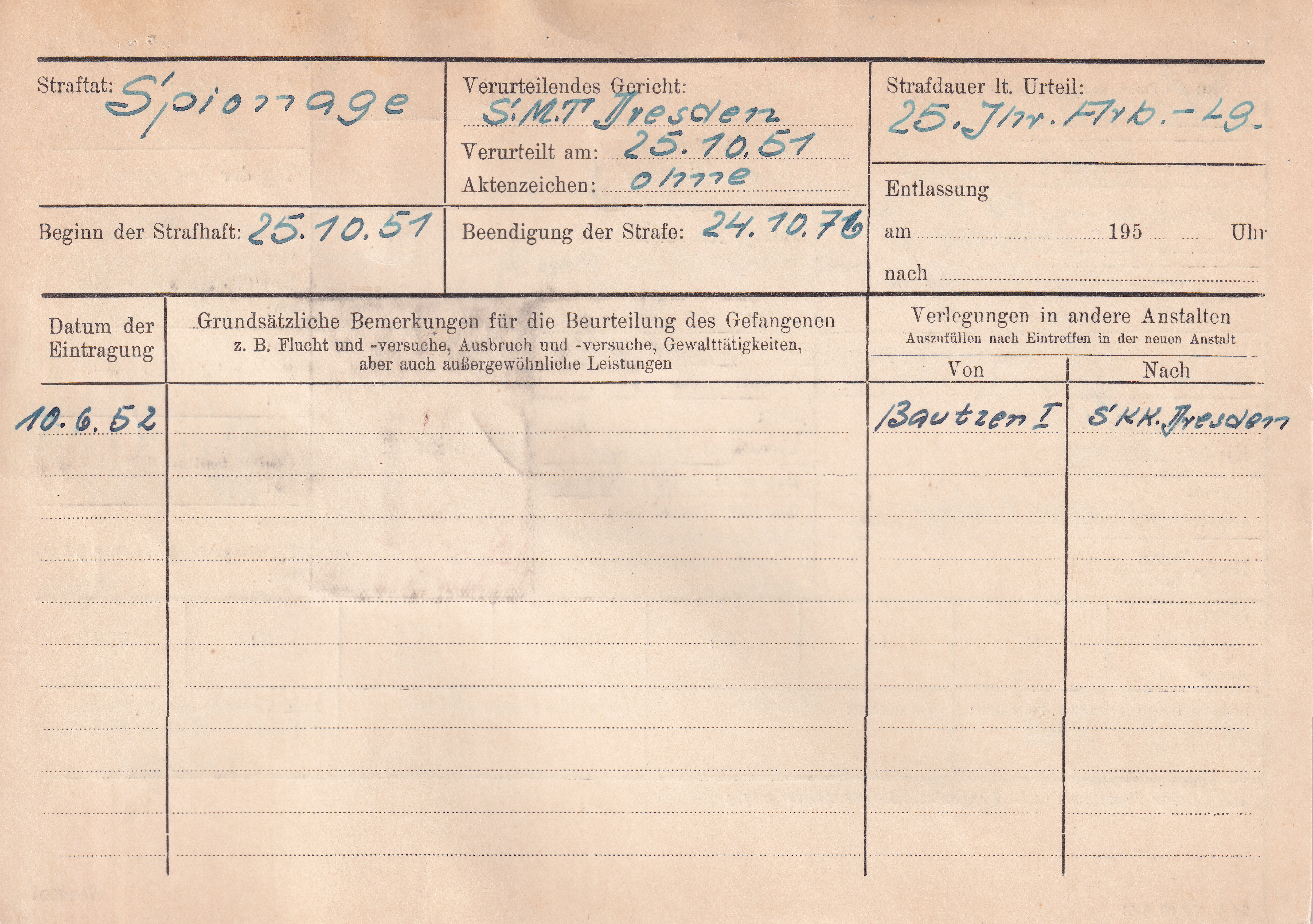 Das Militärtribunal der 1. Garde-Mechanisierten Armee (Feldpostnummer 08640) verurteilte ihn gemeinsam mit Wolfgang Köhler am 19. Januar 1952 in der MGB-Untersuchungshaftanstalt auf der Bautzner Straße nach Artikel 58-6, Abschnitt 1 und Artikel 58-10 des StGB der RSFSR zu 25 Jahren Freiheitsentzug in einem „Besserungsarbeitslager“.