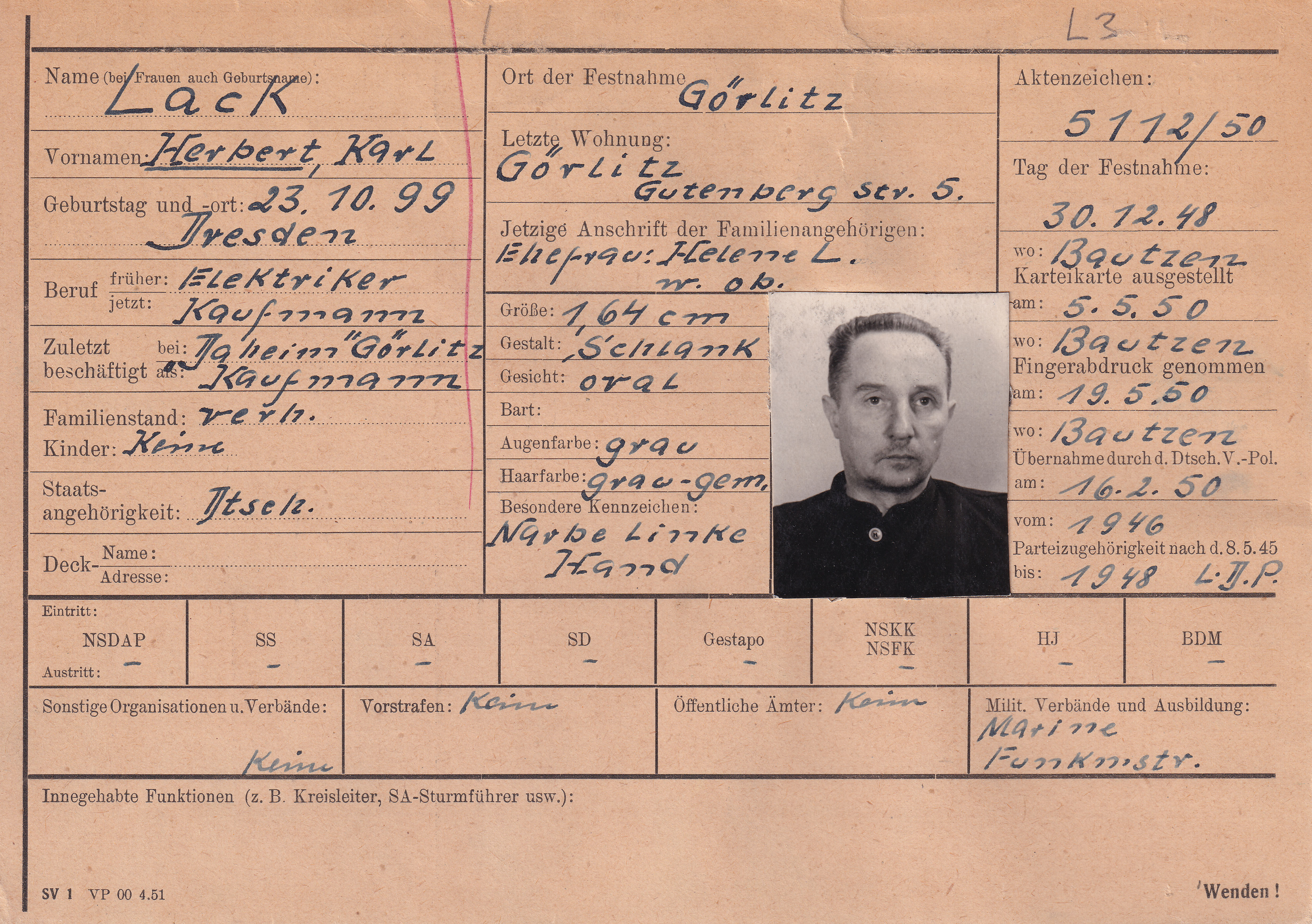 Herbert Lack wurde in Dresden geboren. Er war Elektriker und verheiratet. Die Ehe blieb kinderlos. Während der Herrschaft der Nationalsozialisten war er weder Mitglied der NSDAP noch in einer ihrer Parteiorganisationen. Im Zweiten Weltkrieg diente er als Funker bei der Kriegsmarine.